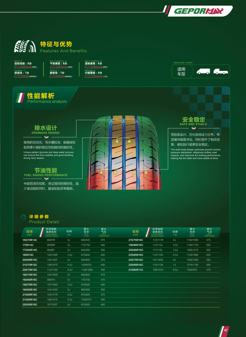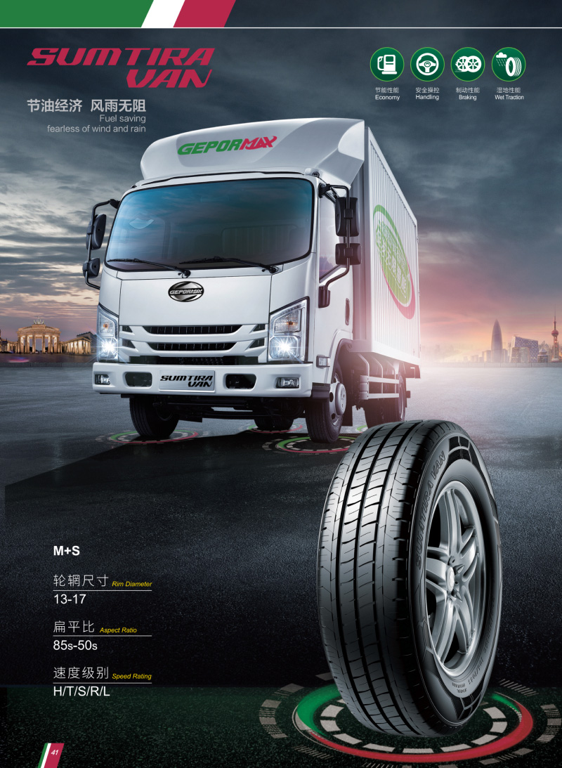 輕型商用車用輪胎,獨特的花紋溝,深排水槽,有較好的排水性和經(jīng)濟燃油性。