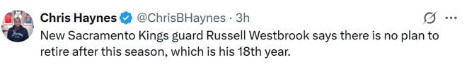 雷速體育10月20日訊 據(jù)名記Chris Haynes報(bào)道,國王新援衛(wèi)威斯布魯克在接受媒體采訪時(shí)表示,目前并無在本賽季結(jié)束后退役的打算。