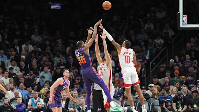 杜蘭特仍是聯(lián)盟中效率最高的“高出手量得分手”之一。上賽季,在至少出戰(zhàn)500分鐘且球權(quán)使用率不低于28%的球員中,僅有約基奇的真實(shí)命中率(66.2%)超過(guò)了他的64.2%。盡管如此,杜蘭特當(dāng)前的效率僅比聯(lián)盟平均水平高出11%;而在他的巔峰期,甚至直到2020-21賽季效力籃網(wǎng)隊(duì)時(shí),他的真實(shí)命中率通常比聯(lián)盟平均水平高出至少16%,2012-13賽季更是達(dá)到21%的峰值。