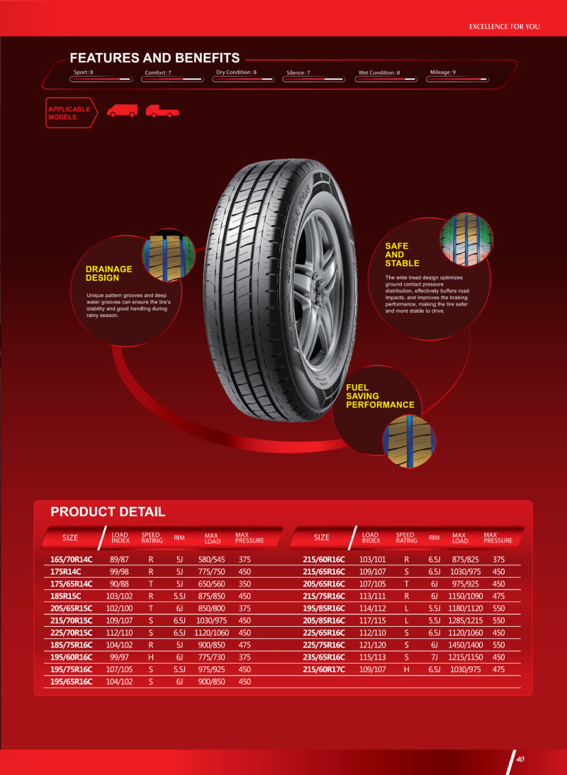 輕型商用車用輪胎,獨(dú)特的花紋溝,深排水槽,有較好的排水性和經(jīng)濟(jì)燃油性。