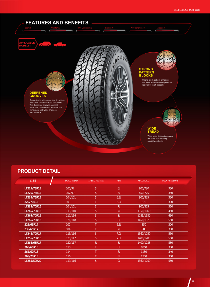 高性能越野輪胎,強壯花紋塊和胎體,能適應(yīng)各種惡劣路況。