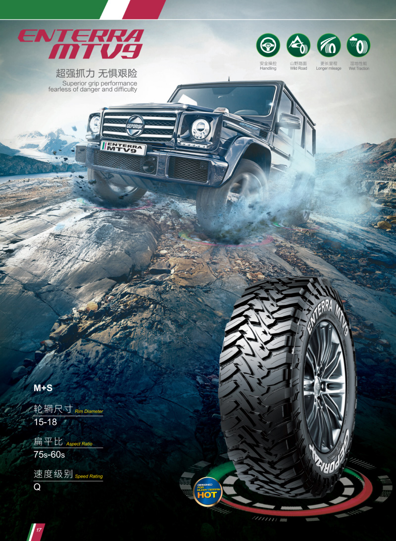 火焰型大塊花紋,是一款用于極限越野的輪胎,惡劣路況下提供超強(qiáng)的驅(qū)動(dòng)力、泥地防滑性能。
