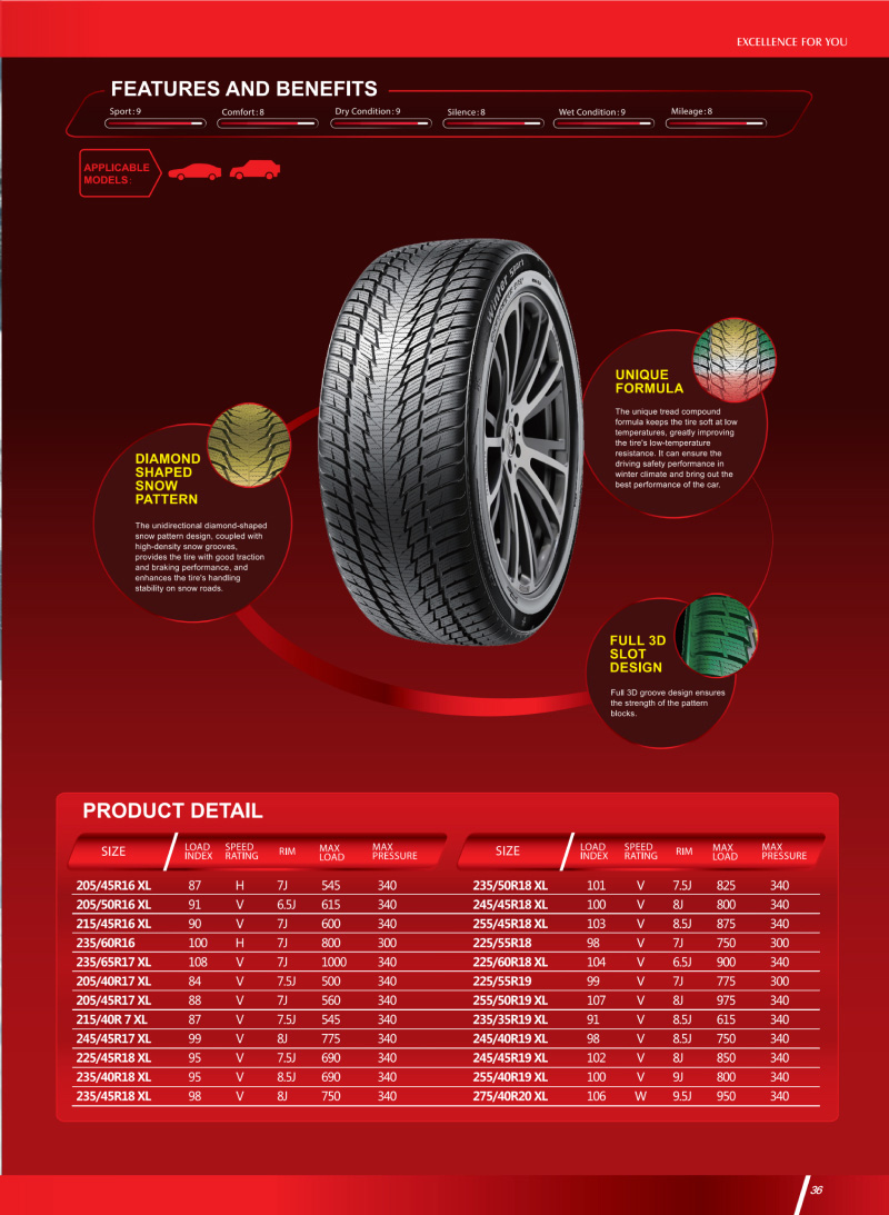 獨(dú)特胎面膠料配方及花紋,為輪胎提供良好的牽引力和制動(dòng)性能,可保證在冬季氣候下的駕駛安全性能。