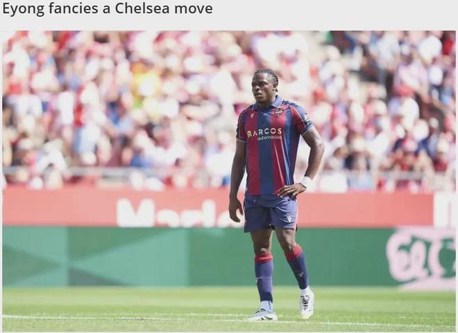 萊萬特前鋒卡爾-埃塔-埃永最近和曼聯(lián)、阿森納以及切爾西等英超豪門聯(lián)系在了一起,而這名22歲的新星在接受采訪時表示他的夢想是加盟切爾西。